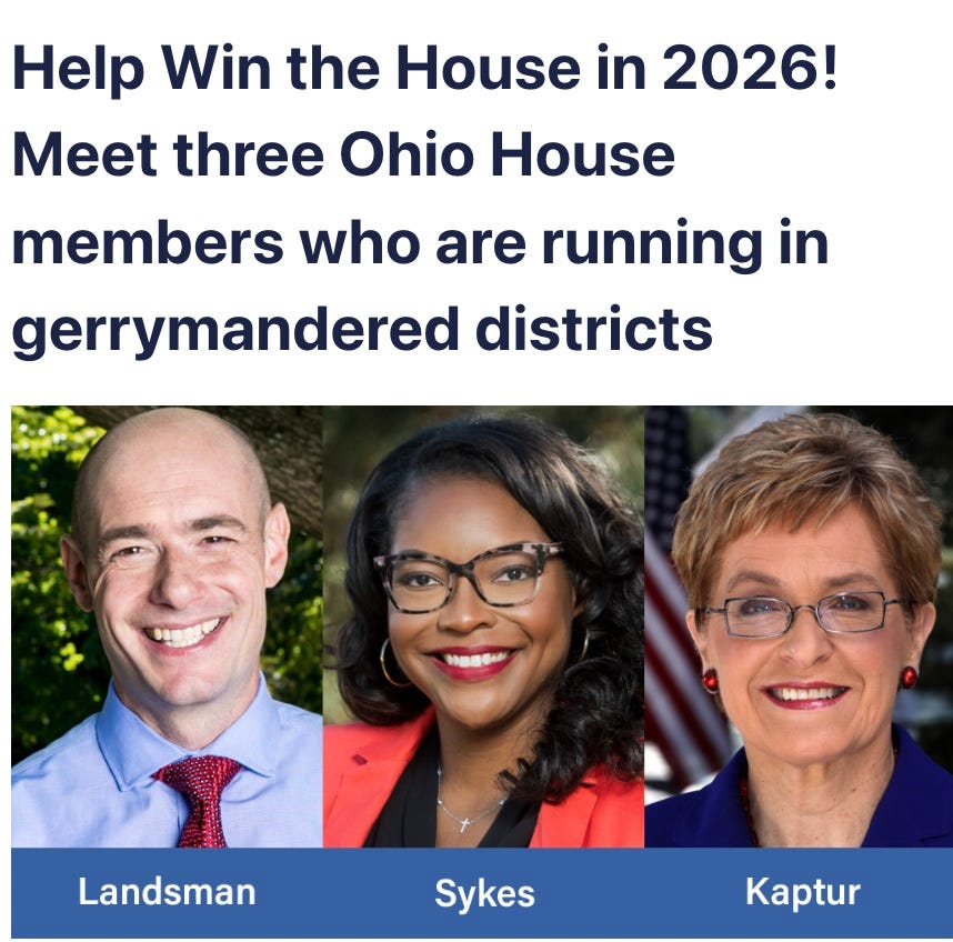 Congressmembers Greg Landsman (OH 01), Emilia Sykes (OH 13) and Marcy Kaptur (OH 09) are defending their seats after recent Ohio partisan gerrymandering. To win a Democratic Majority in the House, we need to defend our most vulnerable incumbents.